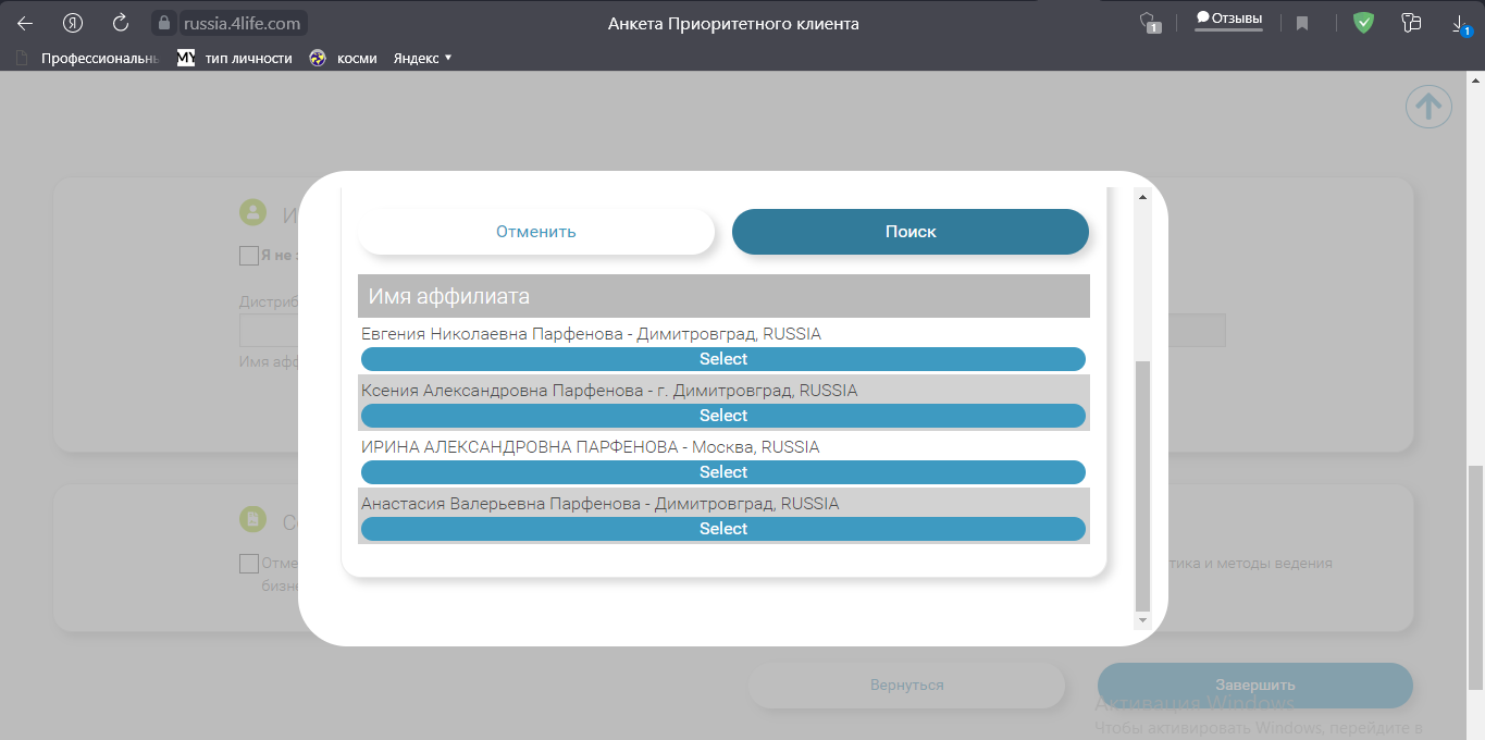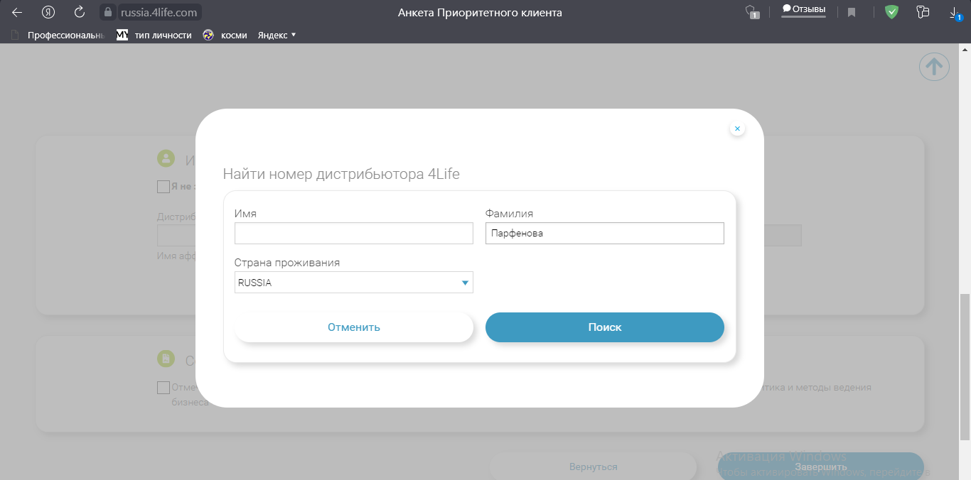 *в графе "Информация об инроллере/спонсоре" вставьте свой ID. Если же так и не нашли свой ID, то вы можете нажать на лупу, ввести свою фамилию и выбрать себя из списка